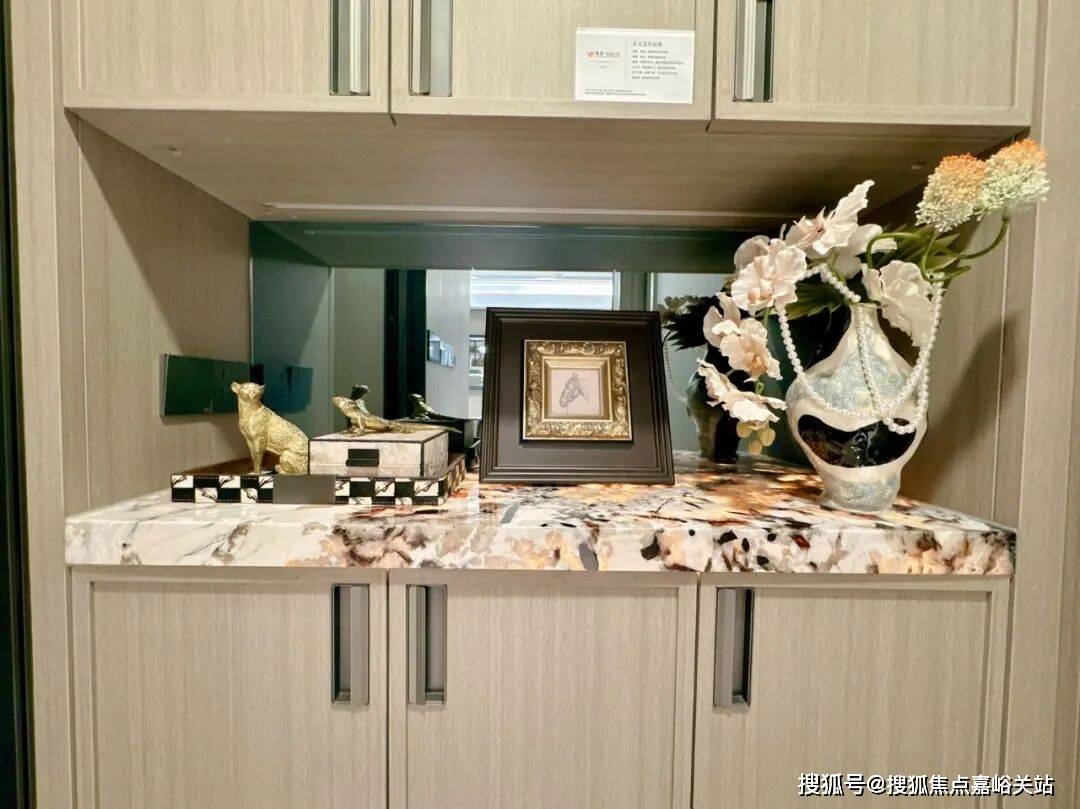 餐厅区域放置一个餐边柜,同样选用了雪山飞狐奢石做透光台面设计,餐边柜在收纳储物方面具有显著作用。