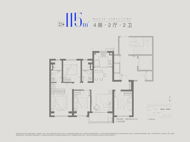 建面约115㎡4房2厅2卫,做到了四开间朝南+全卧室带飘窗+主卧套房设计,一步到位的大四房户型。兼顾大4房的功能性和空间尺度,非常难得,更适合四口之家或三代同堂家庭居住。