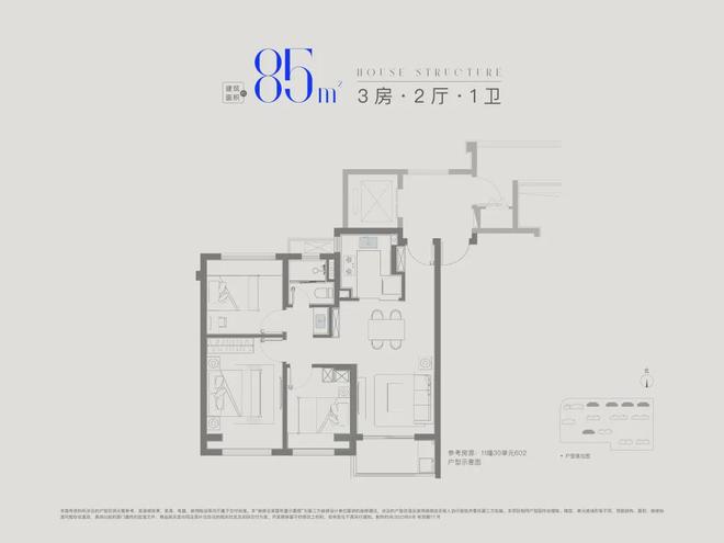 建面约85㎡3房1卫,做到三开间朝南+全卧室带飘窗+卫生间干湿分离+动静分离,非常紧凑的小3房。
